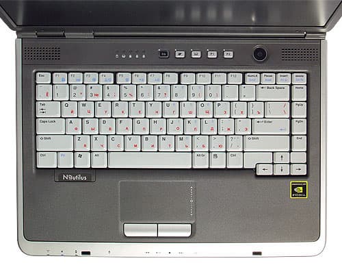 Раскладка клавиатуры понравилась. Единственное даже не замечание, а упрек — клавиша Enter могла бы быть больше. А вот при работе клавиатура показалась мне мягковатой. Впрочем, возможно, кому-то это и понравится. Над клавиатурой — большая кнопка включения ноутбука, кнопки быстрого вызова приложений и индикаторы Lock`ов. Индикаторы состояния ноутбука находятся на переднем торце. Среди стандартных «быстрых» кнопок (вызов МS Internet Explorer, MS Outlook Express и двух пользовательских программ) цветом выделена кнопка работы с камерой. Однократное нажатие на кнопку включает камеру, повторное — делает снимок. Для выключения камеры кнопку необходимо удерживать в течение четырех секунд.