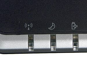 В левой части передней панели сгруппированы основные системные индикаторы. Традиционно их не видно, когда ноутбук стоит закрытым на столе.