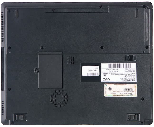 При взгляде снизу можно увидеть отсеки аккумулятора (на фото вверху) и жесткого диска (на фото справа), крышку отсека модулей памяти и плат mini PCI, заборную решетку системы вентиляции и откидные ножки.