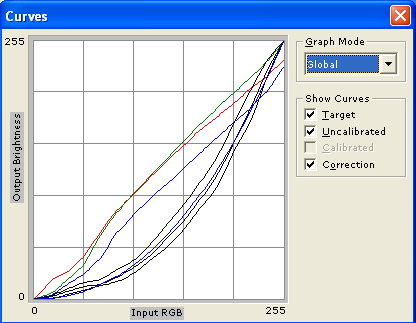 Приведены также графики гамма-кривых, где можно увидеть, насколько гамма-кривые индивидуальных цветов (черные линии) отклоняются от целевой гамма-кривой (синяя линия) и какая требуется коррекция для каждого цвета (соответственно красная, синяя и зеленая линии).