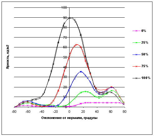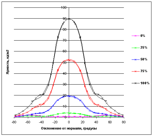 Зависимость яркости полутонов (0% — черный, 100% — белый) в центре экрана от отклонения оси датчика (отрицательные значения — вниз, положительные значения — вверх) от нормали к экрану в вертикальной плоскости