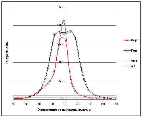 Зависимость контрастности (отношения яркости белого поля к яркости черного) в центре экрана от отклонения оси датчика (отрицательные значения — влево или вниз, положительные значения — вправо или вверх) от нормали к экрану в вертикальной и горизонтальной плоскостях. Зеленая линия — отношение 10:1, голубая — 5:1