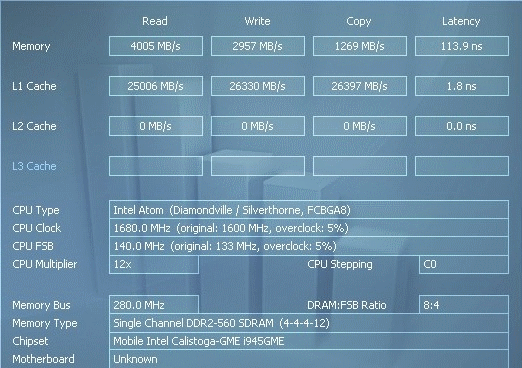 Как видите, сразу становится понятно, почему ASUS был чуть-чуть впереди - у этого нетбука завышена частота FSB, соответственно, и процессор, и память работают на чуть большей частоте. Посмотрим на производительность подсистемы памяти. процессора с любой другой системой, для которой известны результаты тестов.