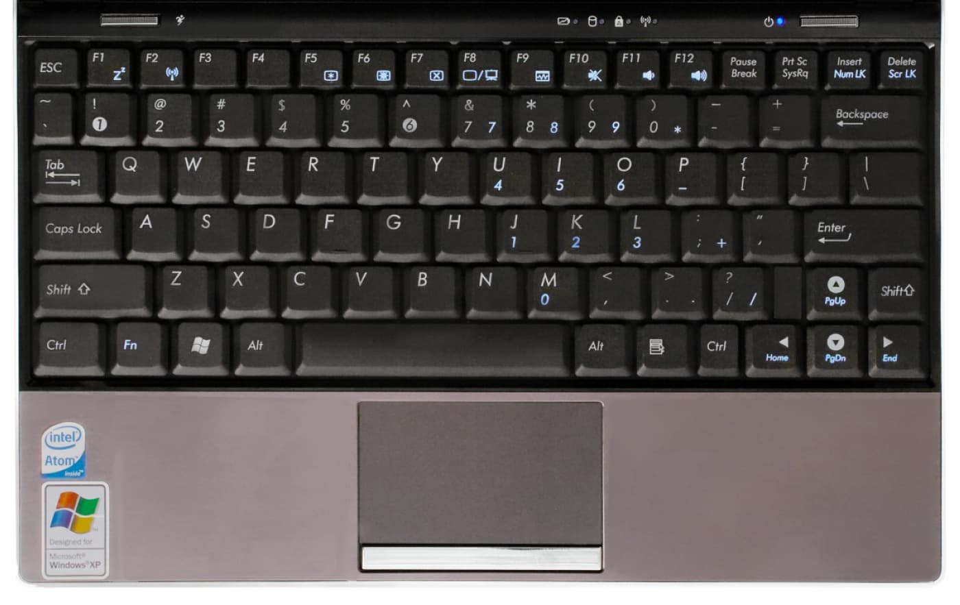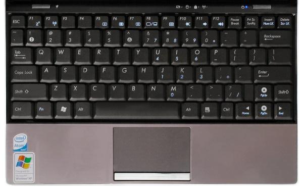 Клавиатура ASUS 1002HA знакома нам по предыдущим моделям. Клавиши здесь чуть меньше, чем на обычных больших ноутбуках, но они все одинакового размера, поэтому если адаптироваться, то можно печатать с высокой скоростью и небольшим количеством промахов. Единственной заметной для меня претензией стал правый shift, он расположен за курсором и далеко от буквенных клавиш – при печати пользоваться им почти невозможно. Для меня лично это небольшой недостаток, я в основном пользуюсь левой клавишей, но при покупке этот момент надо учитывать. Клавиши ровные, сделаны из черной шершавой пластмассы. Нажатие относительно неплохое, хоть и немного размазанное. Клавиши надкурсорного блока, как и в предыдущем случае, «повешены» на сочетания с Fn.