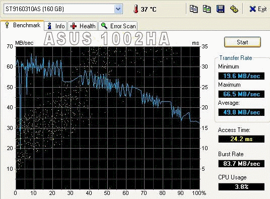 У ASUS график откровенно странный. Я думаю, что у нас на тестировании побывал сэмпл, который уже много пережил, либо какие-то софтверные проблемы. В общем, большинство цифр вполне нормальные, но средняя скорость и время доступа немного разочаровывают. Просто сложно определить, это недостаток конкретного экземпляра или все диски такие.
