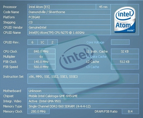 | Процессор | Intel Atom N270, 1.6 ГГЦ (Шина 533 МГЦ, 512 КБ кэш) | ||