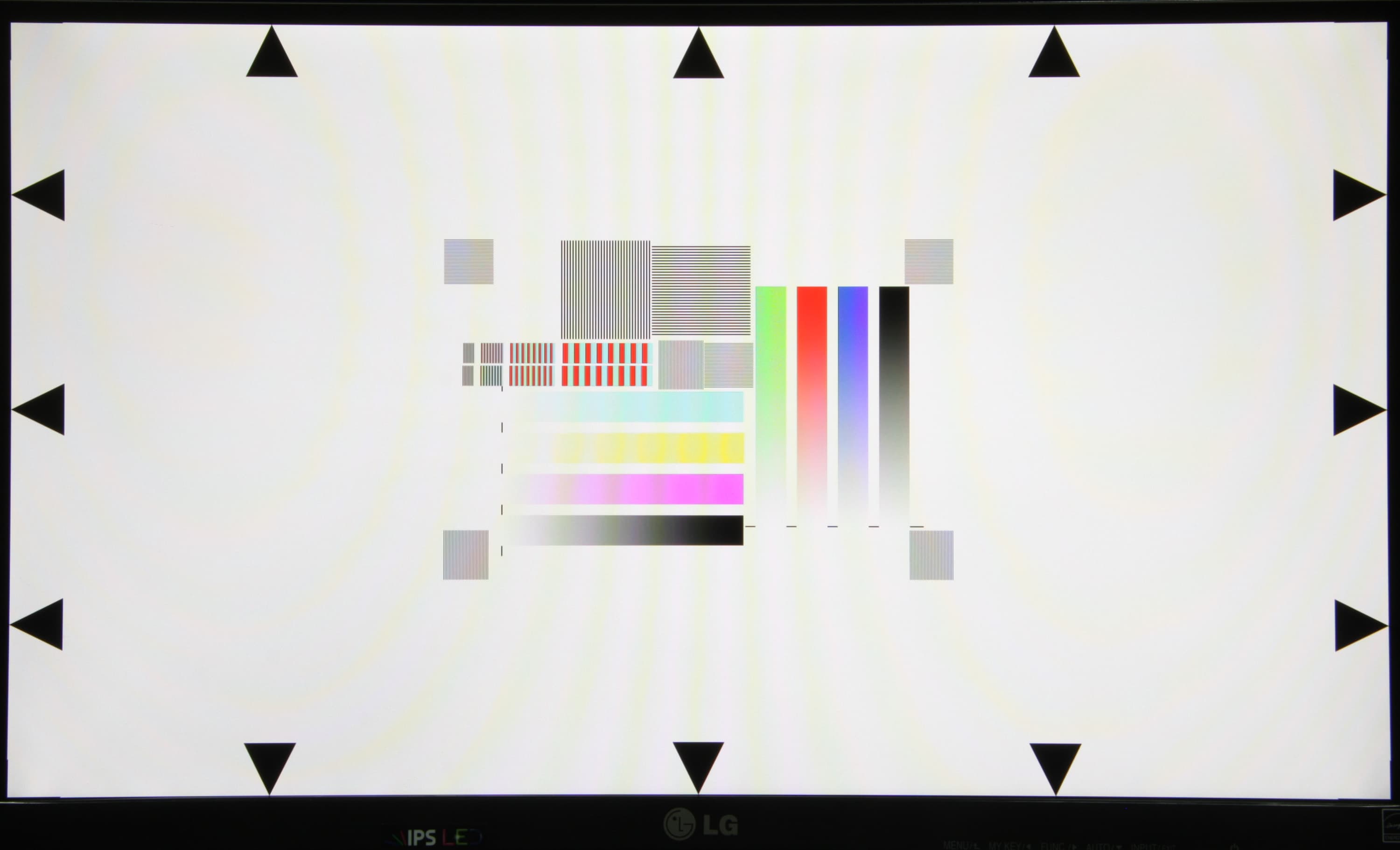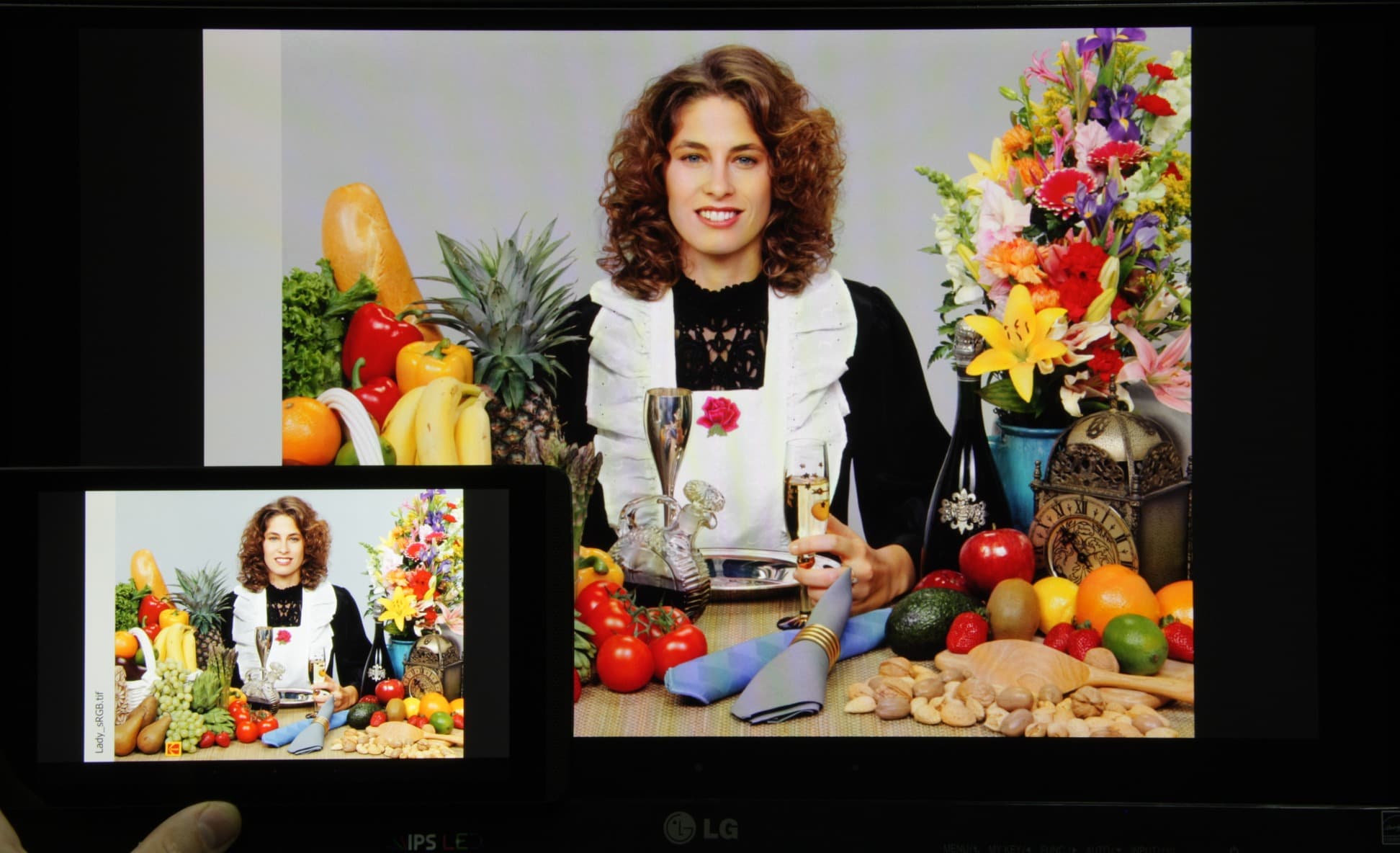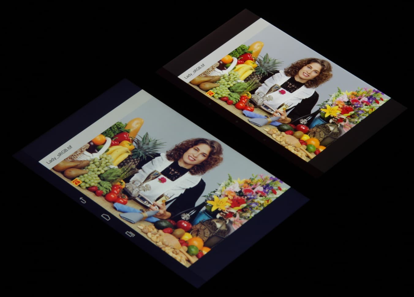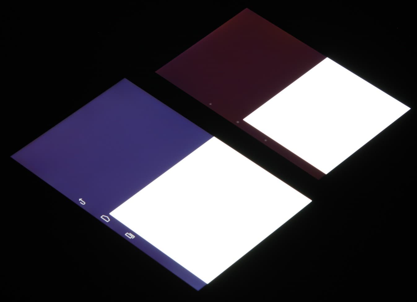 Экран имеет хорошие углы обзора без инвертирования оттенков и без значительного сдвига цветов даже при больших отклонениях взгляда от перпендикуляра к экрану. Для сравнения приведем фотографии, на которых на экраны Nexus 7 и тестируемого планшета (с выбранным профилем sRGB) выведены одинаковые изображения, при этом яркость обоих экранов установлена примерно на 200 кд/м², а цветовой баланс на фотоаппарате принудительно переключен на 6500 К. Перпендикулярно к экранам тестовая картинка: