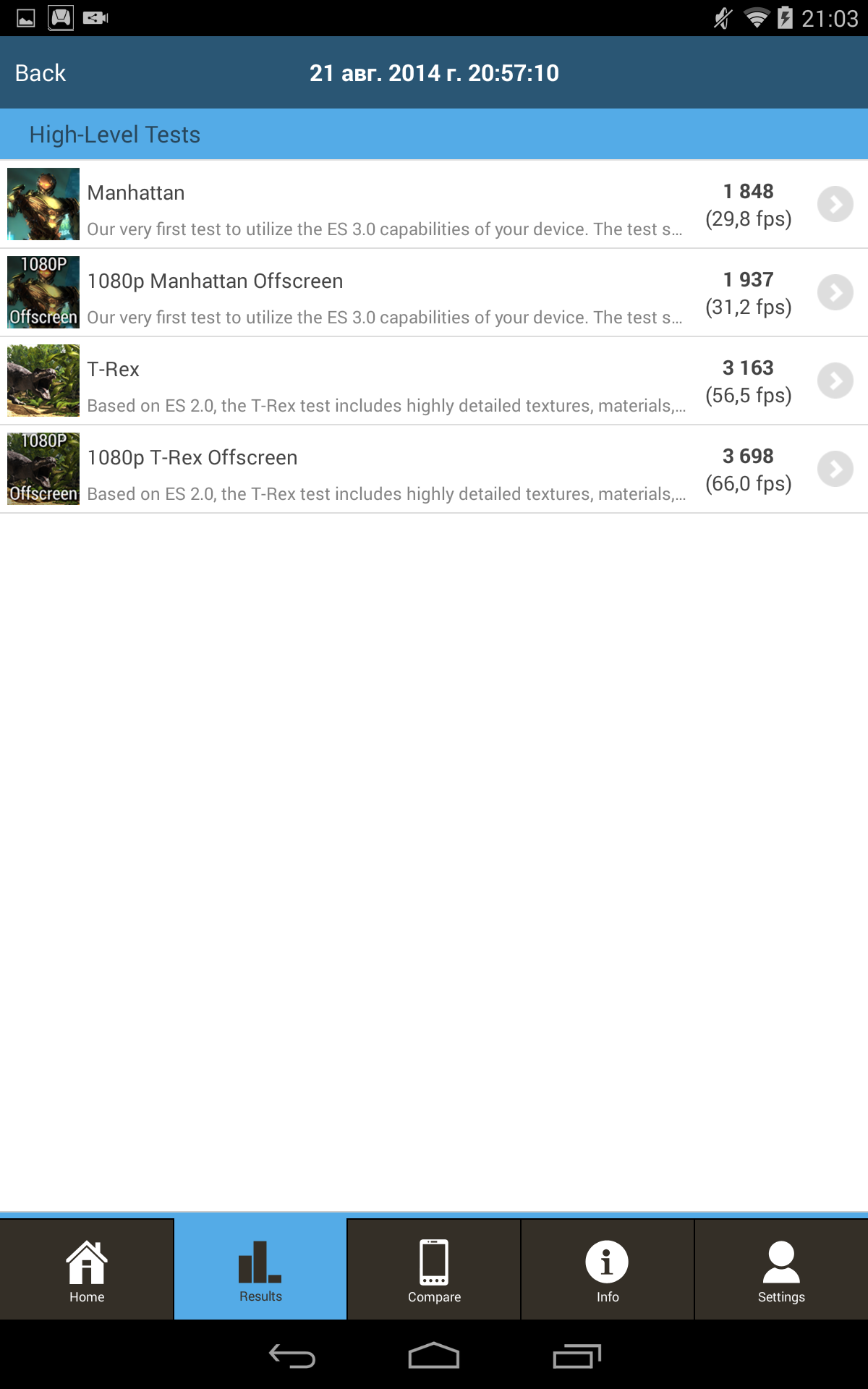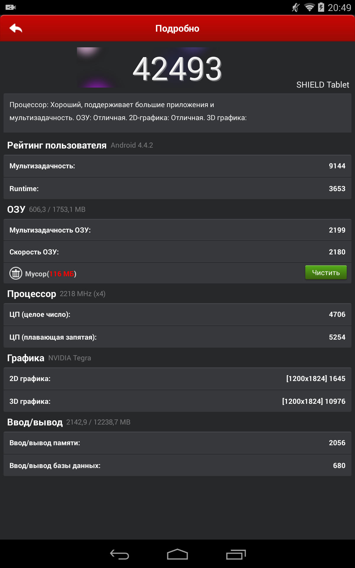Можно было бы предположить, что разница между Shield Tablet и Xiaomi MiPad обусловлен исключительно тем, что разрешение экрана MiPad выше (2048х1536 против 1920х1200), а соответственно, нагрузка на GPU больше, но анализ подробных результатов теста показывает, что планшет Nvidia впереди не только по графике, но и по скорости оперативной памяти и даже по операциям CPU. Можно предположить, что это связано с хорошей оптимизацией конкретного устройства под SoC.