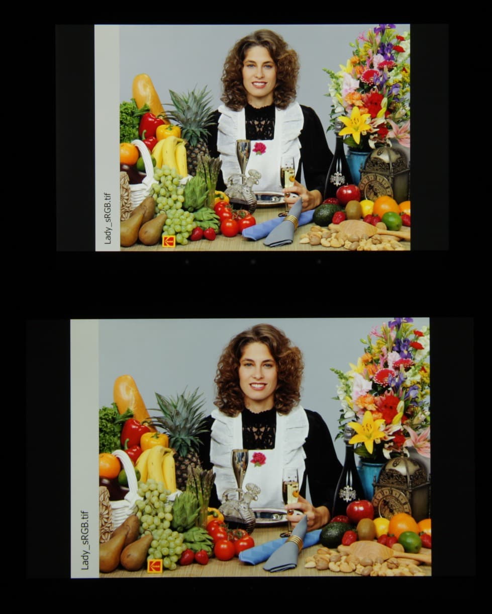 В более ярком профиле без коррекции цветовой баланс чуть хуже, но и вариация характеристик меньше. Видимо, коррекция выполняется цифровым способом в пределах 8-битного (и то условно, так как явно используется динамическое смешение цветов) цвета, что, по идее, должно уменьшать количество градаций оттенков.