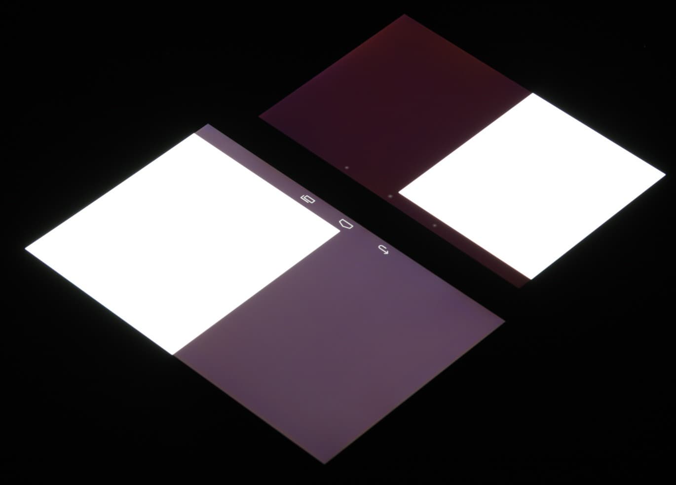 Яркость под углом у обоих планшетов заметно уменьшилась (как минимум в 5 раз, исходя из разницы в выдержке), но в случае Nvidia Shield яркость экрана под этим углом все же немного выше. Черное поле при отклонении по диагонали высветляется очень сильно, и приобретает фиолетовый или красно-фиолетовый оттенок. Фотография с Nexus 7 для сравнения это показывает (яркость белых участков в перпендикулярном направлении у обоих планшетов примерно одинаковая!):