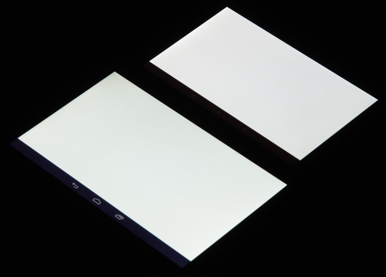 Лицевая поверхность экрана выполнена в виде стеклянной пластины с зеркально-гладкой поверхностью, устойчивой к появлению царапин. Судя по яркости отраженных объектов, антибликовые свойства экрана чуть хуже, чем у Google Nexus 7 (2013) (далее просто Nexus 7). Для наглядности приведем фотографию, на которой в выключенных экранах обоих планшетов отражается белая поверхность (Nvidia Shield — справа, далее их можно различать по размеру, так как экран у него заметно больше, и на всех сравнительных фотографиях ниже тестируемый планшет расположен под Nexus 7):