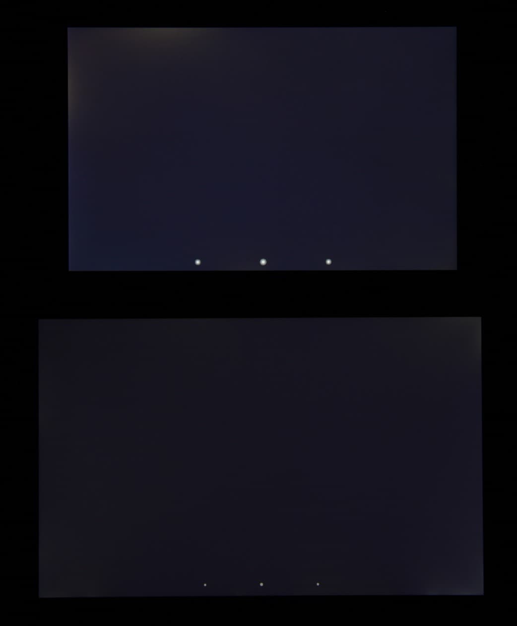 При перпендикулярном взгляде равномерность черного неидеальная, так как по краю, в основном в углах, есть участки с немного с повышенной яркостью черного: