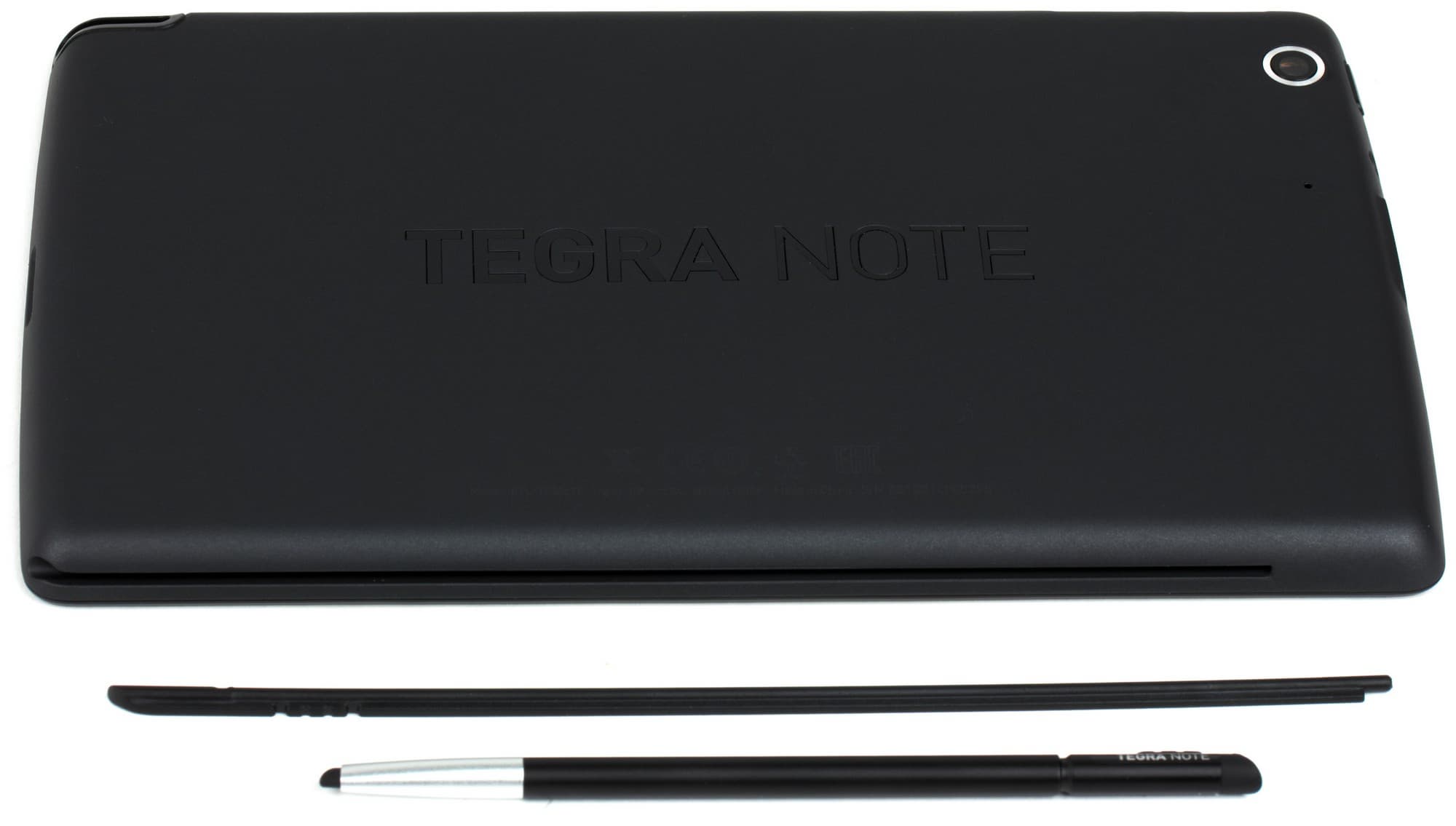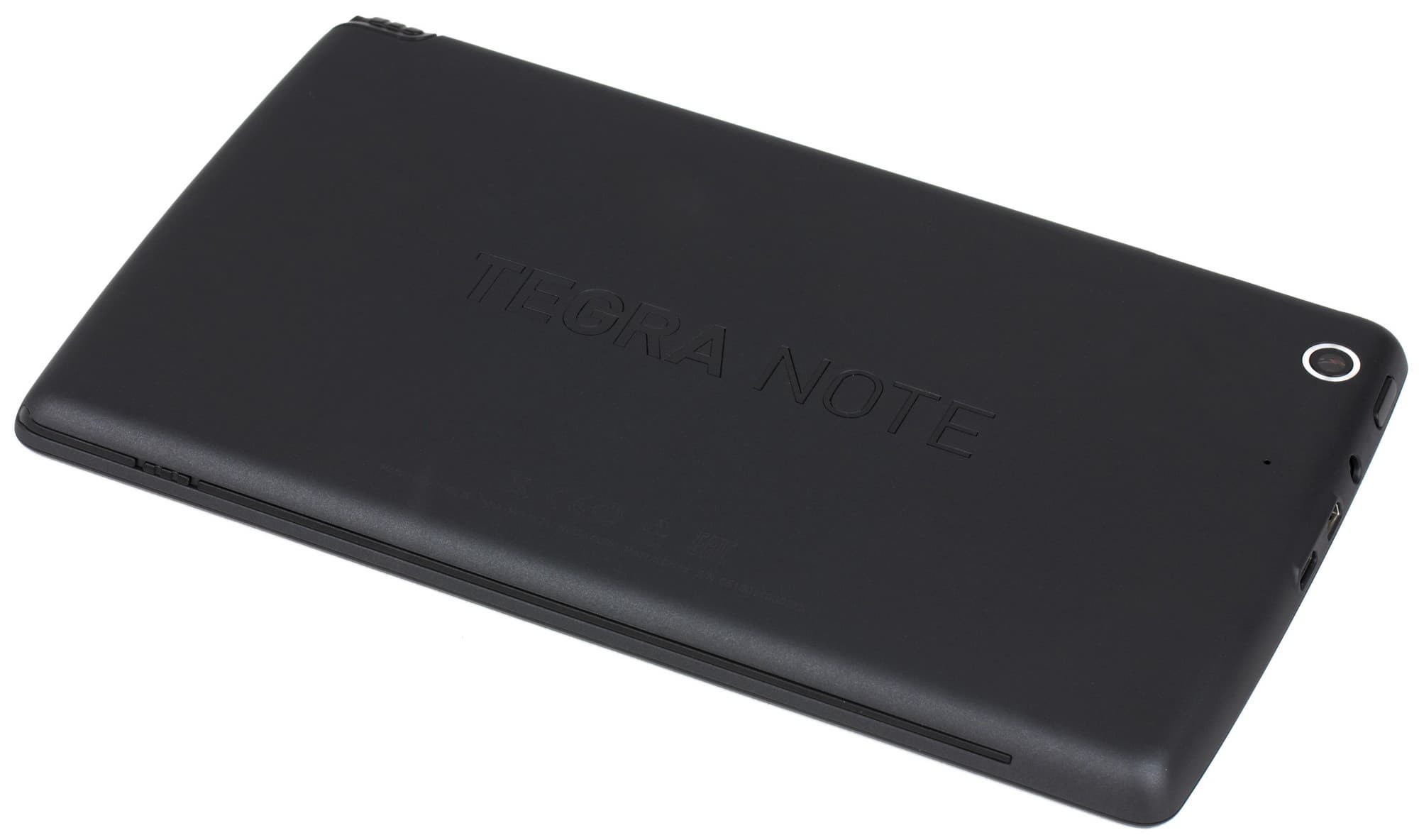 Задняя поверхность имеет покрытие из матового пластика типа soft-touch. В центре выдавлена марка устройства — Tegra Note. В правом верхнем углу — глазок камеры, а под ним — отверстие микрофона. Грани — скошены с задней поверхности. На верхней грани (в том углу, что около камеры) мы видим слоты для SIM-карты и microSD, защищенные заглушкой. Рядом — кнопки регулировки громкости (пластиковые, довольно упругие).