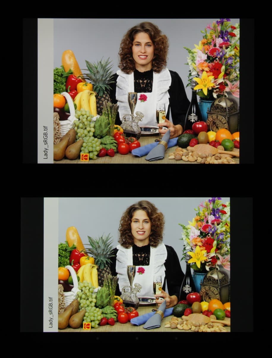 Цветопередача хорошая у обоих экранов, цветовой баланс различается незначительно. При выборе профиля Исходный характер изображения чуть-чуть меняется: