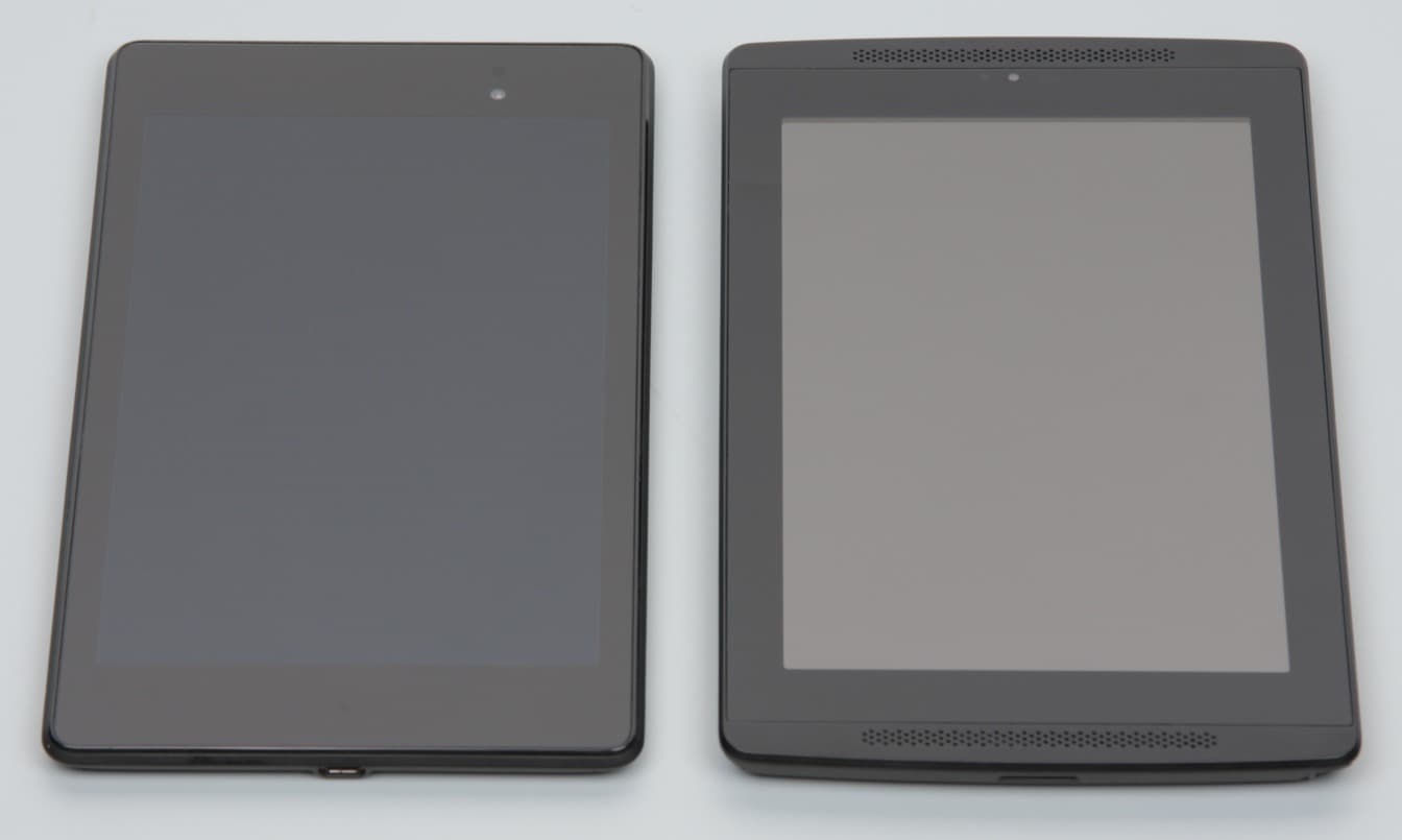 Лицевая поверхность экрана выполнена в виде стеклянной пластины с зеркально-гладкой поверхностью, устойчивой к появлению царапин. Судя по яркости отраженных объектов, антибликовые свойства экрана хуже, чем у Google Nexus 7 (2013) (далее просто Nexus 7). Для наглядности приведем фотографию, на которой в выключенных экранах обоих планшетов отражается белая поверхность (Nvidia Tegra Note 7 — справа, далее их можно различать по размеру области отображения, которая больше из-за убираемых экранных кнопок, и на всех сравнительных фотографиях ниже тестируемый планшет расположен над Nexus 7):