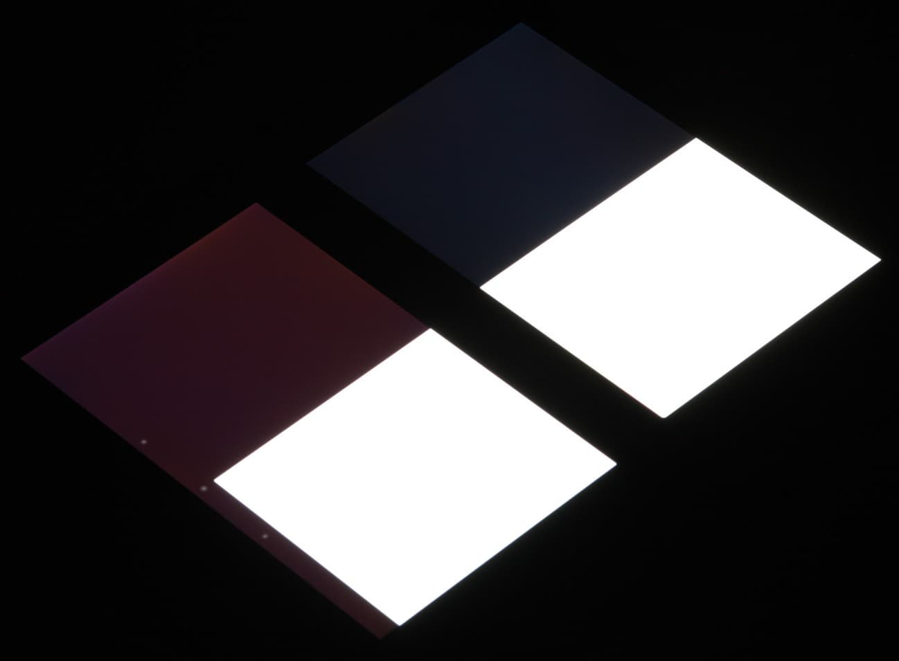 Яркость под углом у обоих планшетов заметно уменьшилась (как минимум в 5 раз, исходя из разницы в выдержке), и уменьшилась примерно одинаково. Черное поле при отклонении по диагонали высветляется слабо, и приобретает фиолетовый или красно-фиолетовый оттенок. Фотография с Nexus 7 для сравнения это показывает (яркость белых участков в перпендикулярном направлении у обоих планшетов примерно одинаковая!):