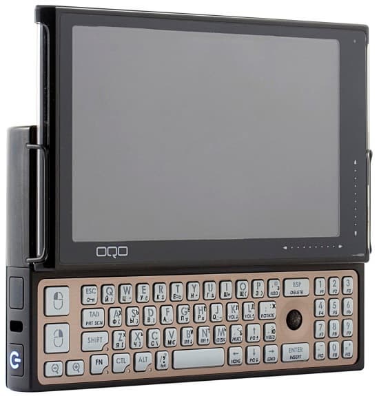 С первого взгляда OQO напоминает большой КПК или коммуникатор. И размерами, и соотношением сторон корпуса, и общим внешним видом. По конструкции корпуса OQO горизонтальный слайдер. Экран сдвигается по длинной стороне, под ним расположена клавиатура. Выглядит OQO стильно и дорого.