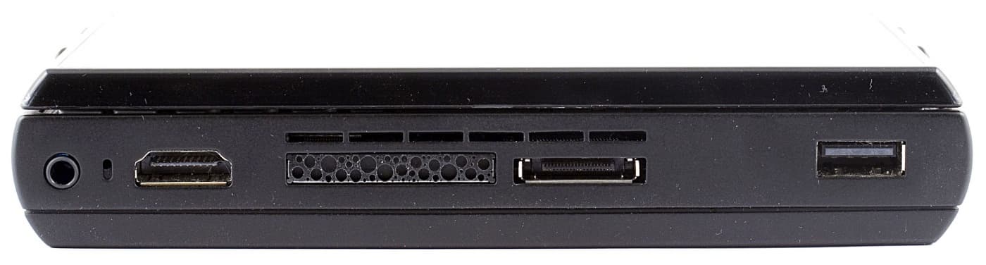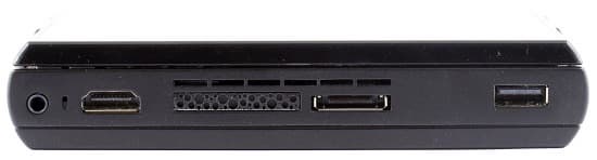 Все разъемы расположены на нижней грани. Левее всего находится аудиоразъем (это обычный штекер 3,5 мм, в него можно вставить наушники или любой кабель). Далее идет HDMI OQO можно подключать монитору или современному телевизору и использовать их как более крупный дисплей, также можно подключить OQO к проектору (HDMI в принципе, та же реализация DVI). Далее, за решеткой вентиляции находится универсальный разъем. В него можно напрямую вставить зарядку, а можно специальный порт расширения: на нем есть такой же разъем (в который вставляется зарядка), а также аналоговый выход VGA на внешний монитор и разъем для проводной сети. Наконец, в правой части находится порт USB. Очевидно, что при постоянном использовании один порт это очень мало, если подключать внешние устройства. Например, вставил флэшку и привет. Если вы хотите использовать внешнюю клавиатуру и мышь, то нужно обязательно иметь USB-хаб или пользоваться беспроводной техникой с поддержкой Bluetooth. Впрочем, это мелочи, т.к. OQO не может самостоятельно стоять на столе под удобным углом, т.е. его либо надо ставить на подставку (или док-станцию), или подключать и монитор, и периферию, тогда необходимость использования хаба уже непринципиальна (или использовать порты на доке).