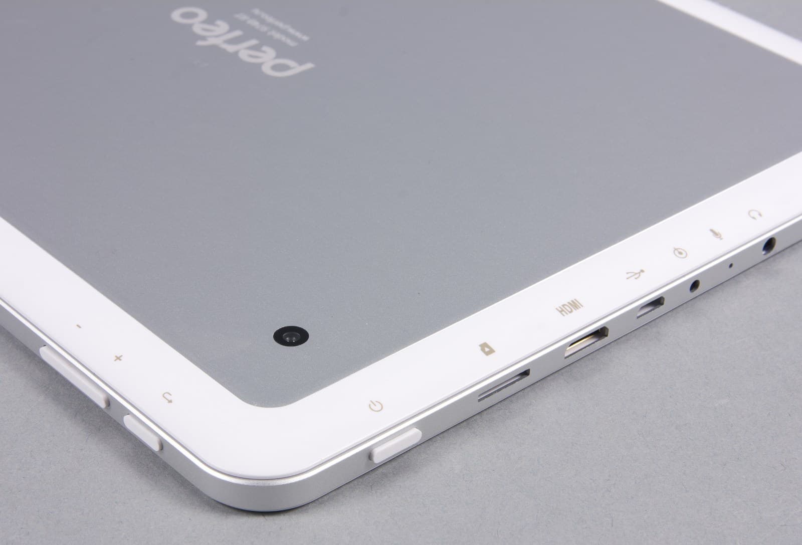 На соседней грани находится идентичная кнопке «Домой» кнопка включения, а рядом с ней — все функциональные элементы планшета: подпружиненный слот microSD, Mini-HDMI, Micro-USB, разъем сетевого адаптера, отверстие микрофона и гнездо 3,5 мм для наушников. Для того, чтобы вставить штырек адаптера в соответствующий разъем, нужно приложить немалое усилие.