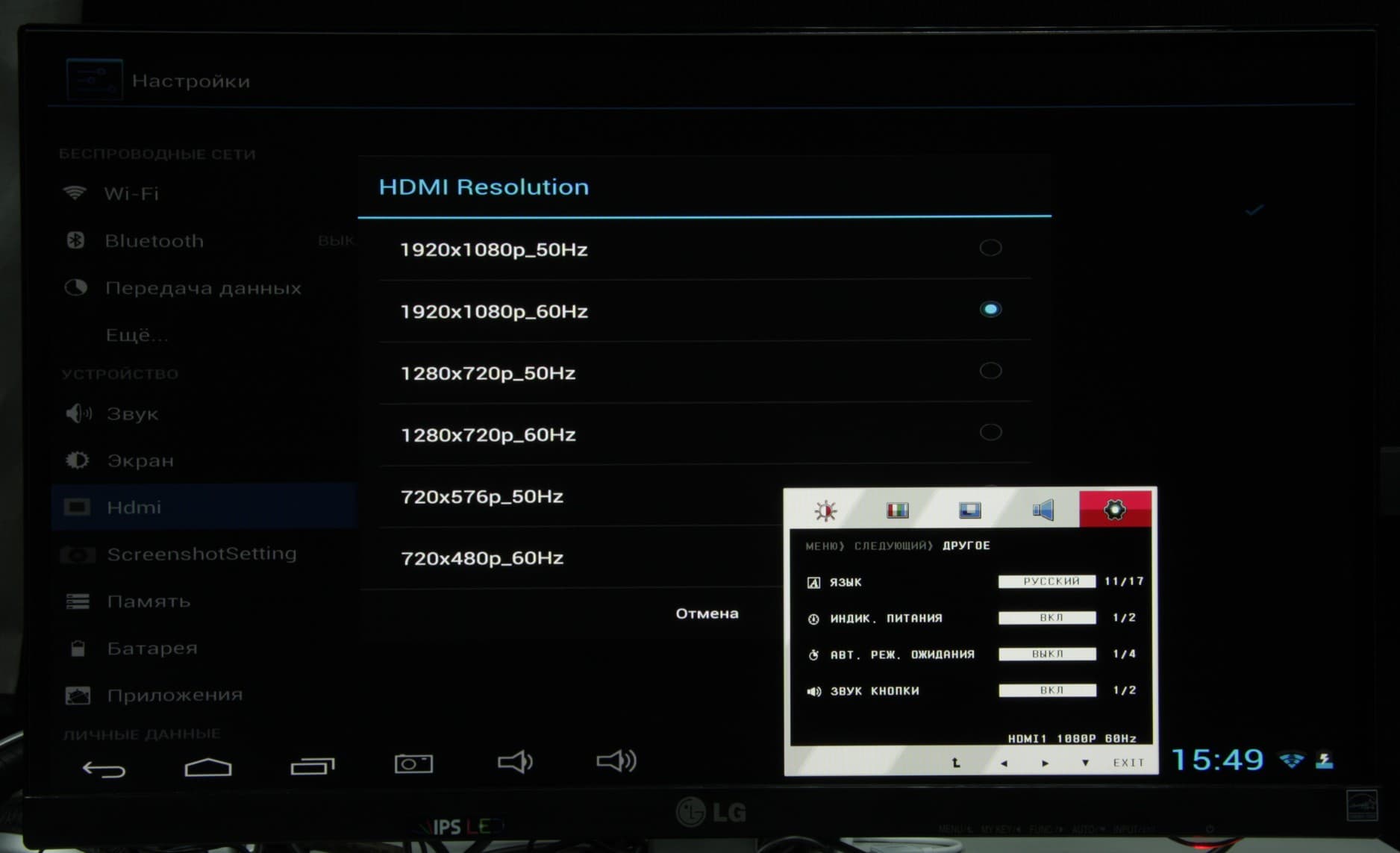 Дополнительно был протестирован интерфейс HDMI. Для его тестирования мы использовали монитор LG IPS237L. Режим вывода можно выбрать в меню установок: