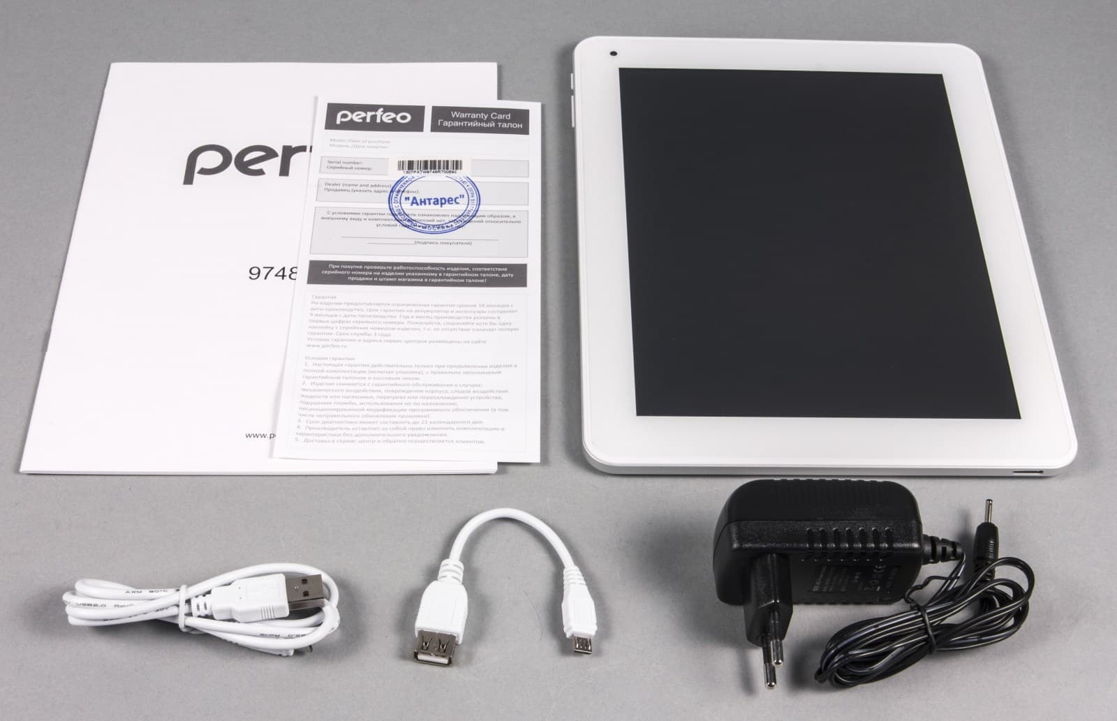 Комплект поставки Perfeo 9748-RT стандартен для недорогих планшетов. Имеется инструкция с гарантийным талоном, USB-кабель, переходник OTG, а также мощный сетевой адаптер, выдающий ток силой 2 А.
