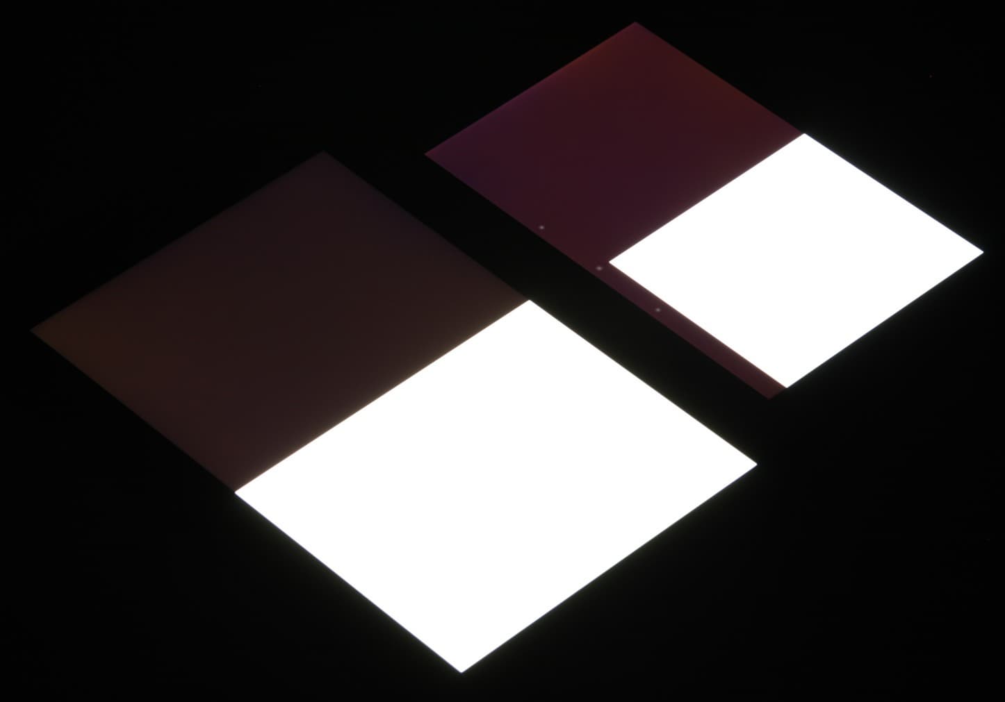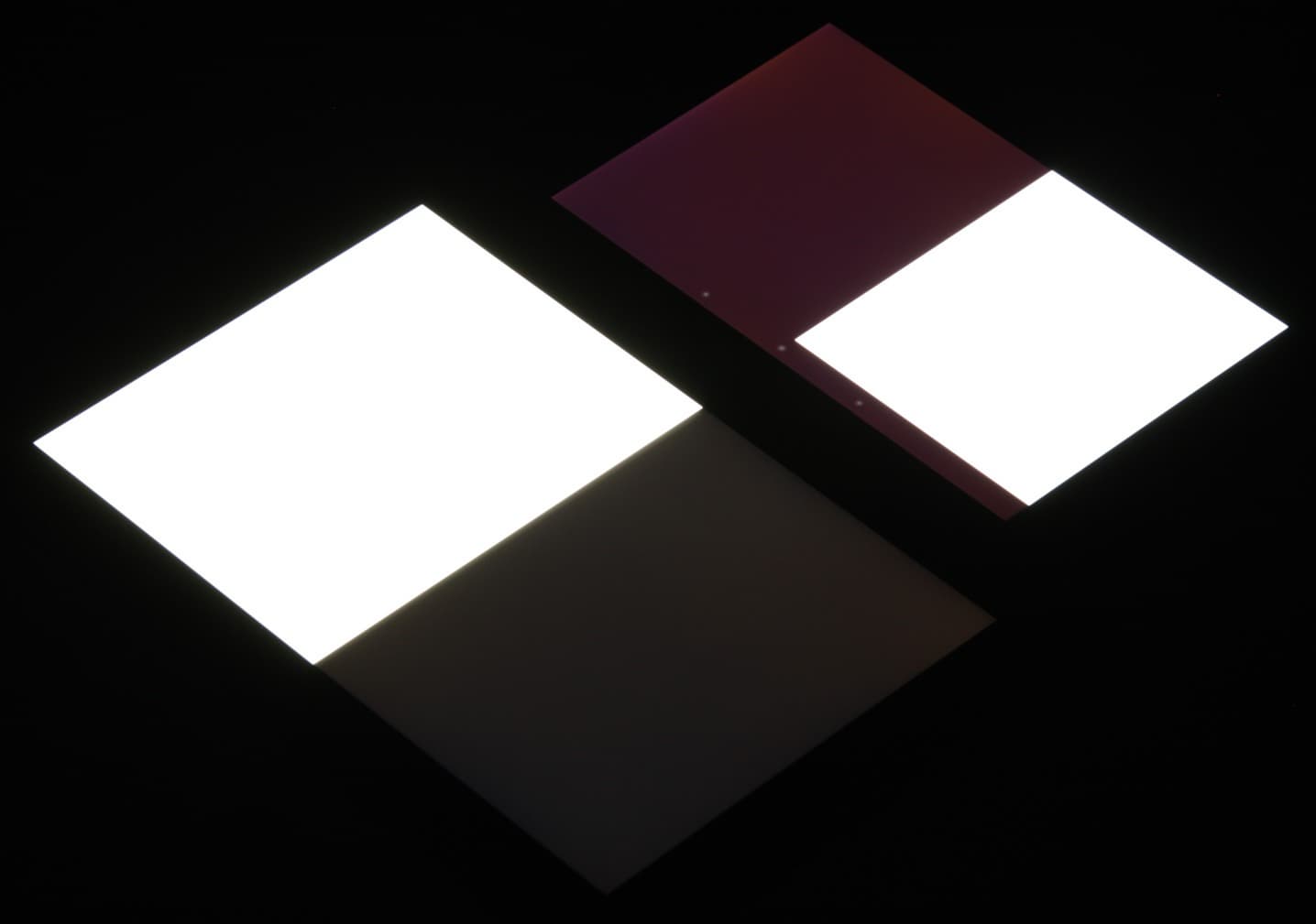 Яркость под углом у обоих планшетов заметно уменьшилась (как минимум в 5 раз, исходя из разницы в выдержке), но в случае Pipo P4 яркость экрана под этим углом все же выше. Черное поле при отклонении по диагонали высветляется слабо и приобретает красно-фиолетовый оттенок. Фотография с Nexus 7 для сравнения это показывает (яркость белых участков в перпендикулярном направлении у обоих планшетов примерно одинаковая!):