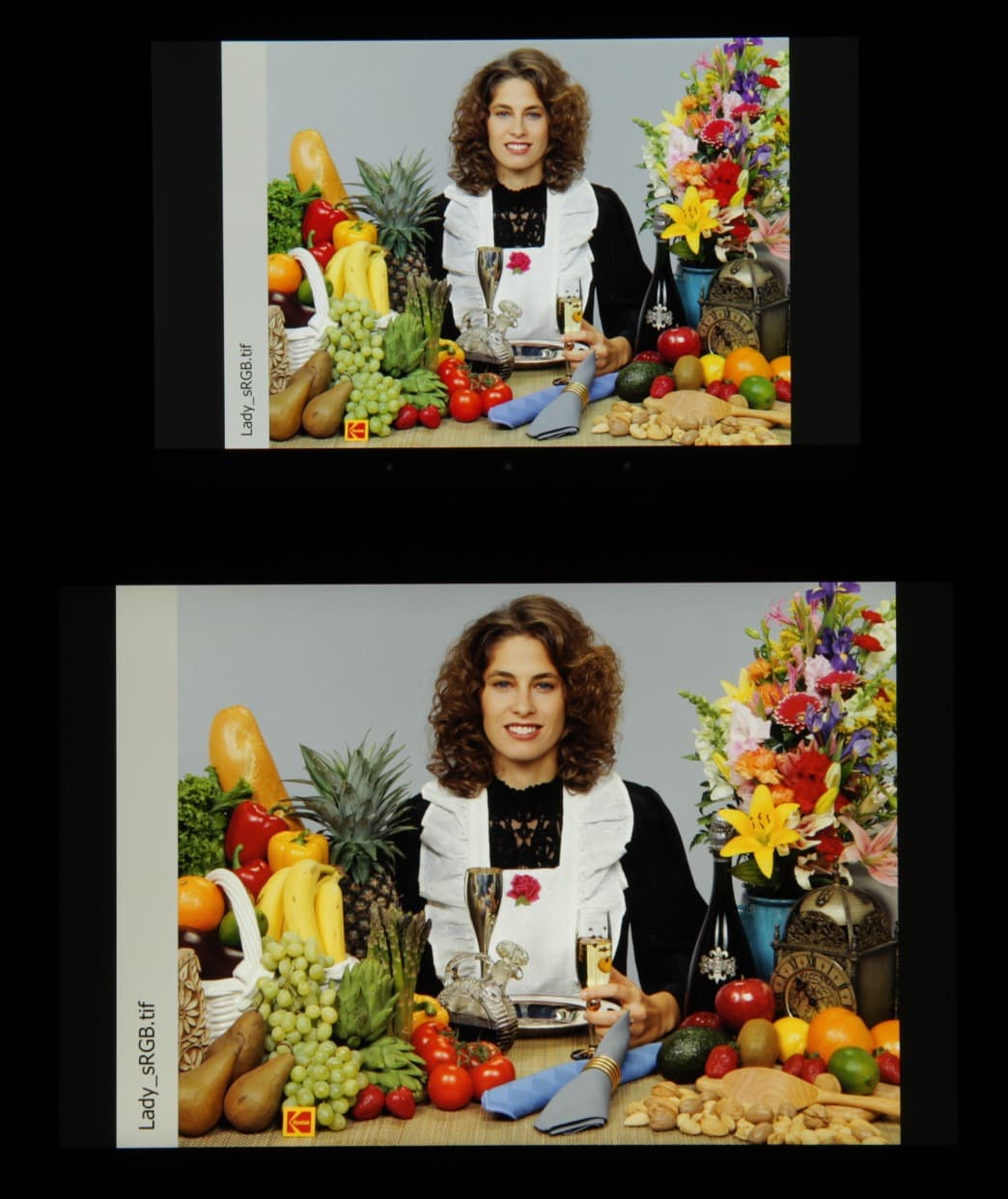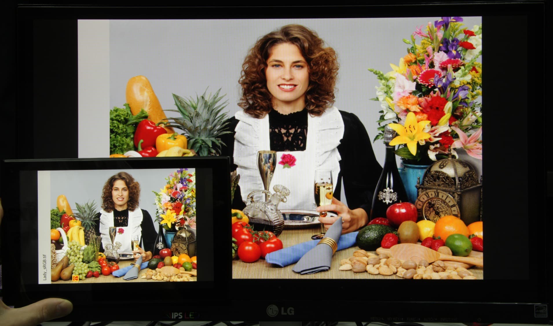 Данный прием позволяет увеличить яркость экрана при тех же затратах энергии на подсветку. В итоге цвета изображений — рисунков, фотографий и фильмов, — ориентированных на пространство sRGB (а таких подавляющее большинство), имеют слегка уменьшенную насыщенность. Баланс оттенков на шкале серого приемлемый, так как цветовая температура близка к стандартным 6500 К, и отклонение от спектра абсолютно черного тела (ΔE) меньше 10, что для потребительского устройства считается хорошим показателем. Однако при этом ΔE сильно изменяется от оттенка к оттенку — это отрицательно сказывается на визуальной оценке цветового баланса. (Темные области шкалы серого можно не учитывать, так как там баланс цветов не имеет большого значения, да и погрешность измерений цветовых характеристик на низкой яркости большая.)