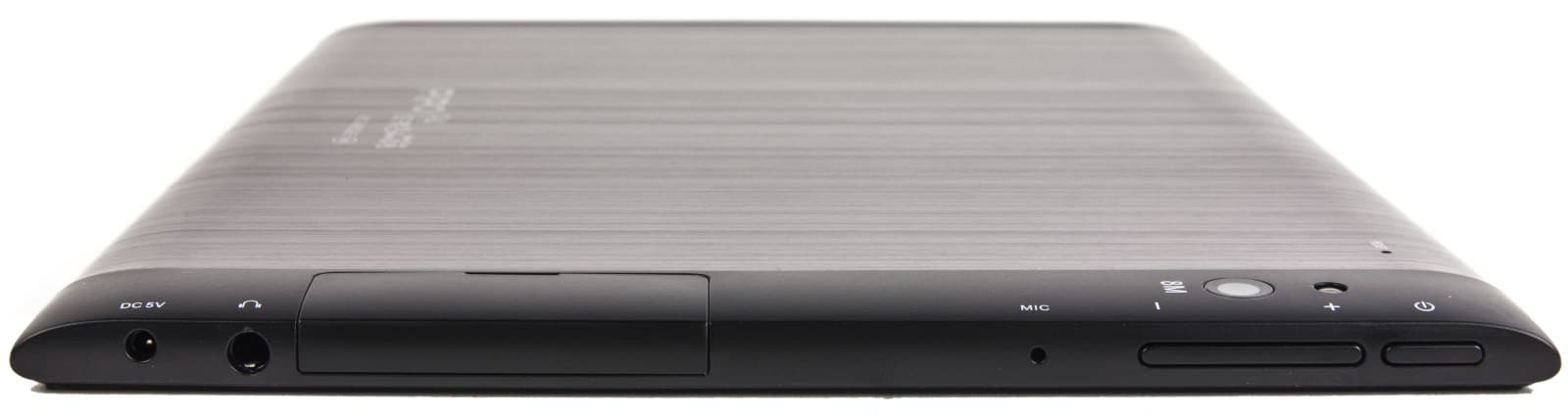 Рядом с кнопками находится отверстие микрофона. Помимо выполнения своей основной функции оно еще и сигнализирует красным светом о том, что планшет в данный момент заряжается. С противоположной стороны грани выведена пара разъемов — 3,5 мм для наушников и коаксиальный разъем сетевого адаптера.