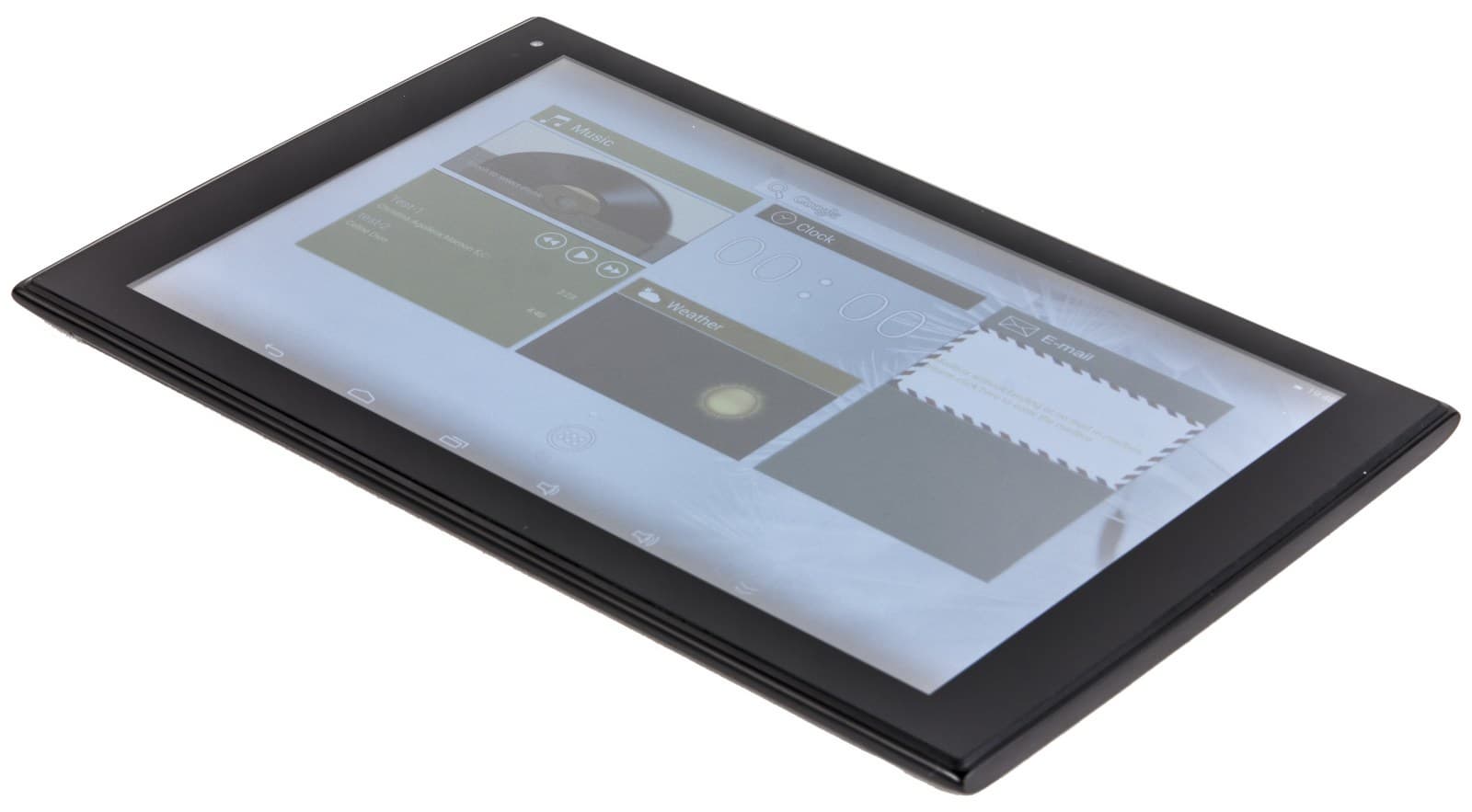 Лицевая поверхность экрана выполнена в виде стеклянной пластины с зеркально-гладкой поверхностью, устойчивой к появлению царапин. Судя по яркости отраженных объектов, антибликовые свойства экрана хуже, чем у Google Nexus 7 (2013) (далее просто Nexus 7). Для наглядности приведем фотографию, на которой в выключенных экранах обоих планшетов отражается белая поверхность (Pipo P4 — слева, далее их можно различать по размеру):