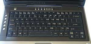 Панель кнопок быстрого вызова приложений расположена слева сбоку, из-за чего пришлось уменьшить размер клавиатуры и оказался «съеден» правый столбец клавиш. В результате клавиатура получилась «субноутбучная». На мой взгляд, это ошибочное решение удобство клавиатуры заведомо важнее и дизайнерских изысков и нескольких кнопок. Отсутствие на клавиатуре русского алфавита издержки сэмпла. В продажу пойдут ноутбуки с локализованной клавиатурой. Сама панель кнопок быстрого вызова достаточно стандартная.
