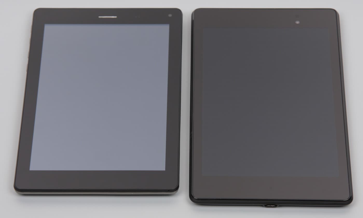 Лицевая поверхность экрана выполнена в виде стеклянной пластины с зеркально-гладкой поверхностью, устойчивой к появлению царапин. Судя по отражению объектов, наличие антибликового фильтра можно поставить под сомнение. Для наглядности приведем фотографии, на которых в выключенных экранах Google Nexus 7 (2013) (далее мы сравниваем именно с ним) и Ritmix RMD-758 отражается белая поверхность (Ritmix RMD-758 — слева, на всех нижеследующих фотографиях он сверху):
