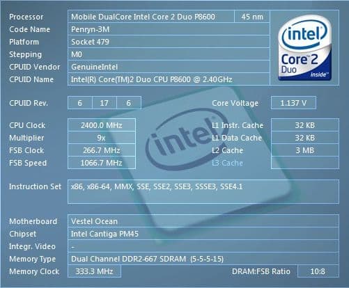 | Процессор | Intel Core 2 Duo P8600 (2,4 ГГц), системная шина 1066 МГц, кэш память L2 3 Мб | Mobile DualCore Intel Core 2 Duo P8600, 2400 MHz (9 × 267) |