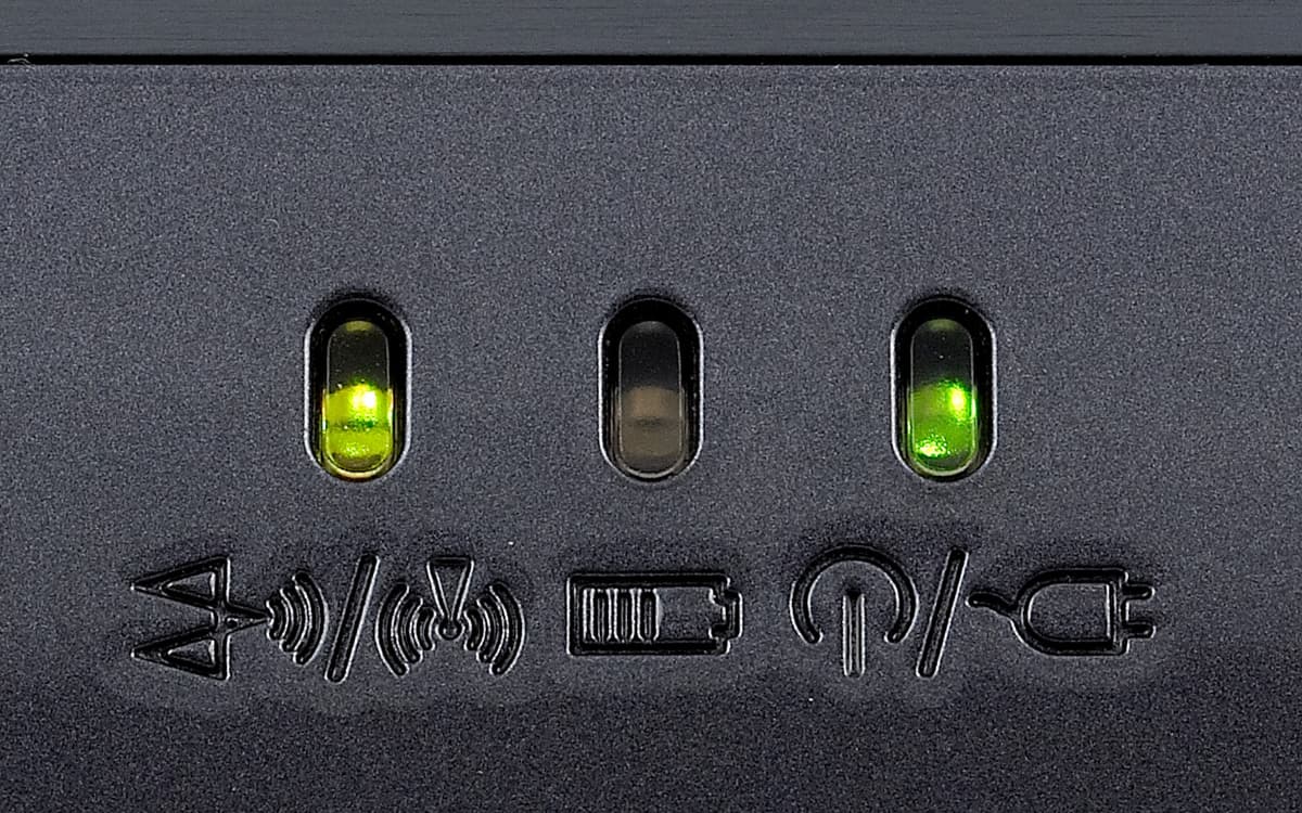 Расшифровка выполнена в виде выдавленных на черной глянцевой пластмассе символов, различается с трудом — приходится вглядываться. Самый левый индикатор показывает состояние ноутбука (работа/сон), средний — состояние батареи, самый правый — работу беспроводных интерфейсов Wi-Fi и Bluetooth. Весь этот блок сделан практически так же, как у модели, которая тестировалась в 2003 году.