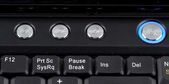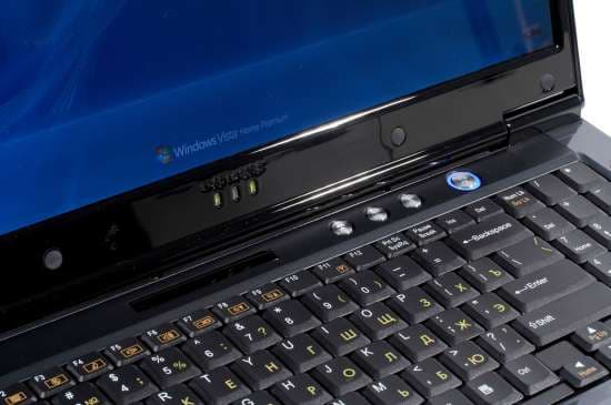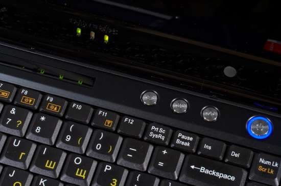 Рабочие индикаторы сосредоточены под стеклянной вставкой над клавиатурой ноутбука. Индикаторы выполнены в виде прозрачных рисунков на черной поверхности, которые снизу подсвечиваются зелеными светодиодами.