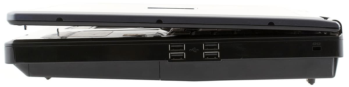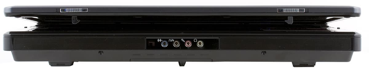На передней стенке расположены аудиоразъемы и ИК-порт. Разъемы не очень мешаются, так как толщина корпуса очень большая, и они не попадают под руки. Тем не менее, провода будут проходить перед ноутбуком, что не очень хорошо.