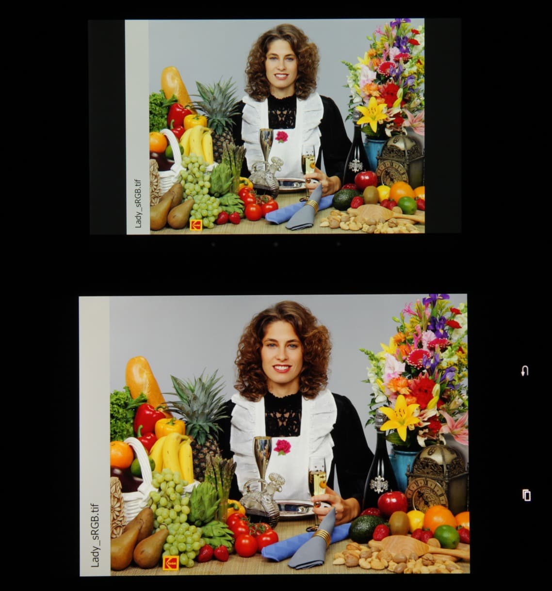 В итоге цвета изображений — рисунков, фотографий и фильмов, — ориентированных на пространство sRGB (а таких подавляющее большинство), имеют естественную насыщенность. Баланс оттенков на шкале серого хороший, так как цветовая температура несильно выше стандартных 6500 К, и отклонение от спектра абсолютно черного тела (ΔE) меньше 10, что для потребительского устройства считается приемлемым показателем. При этом вариация цветовой температуры и ΔE небольшая, что также положительно сказывается на визуальном восприятии цветового баланса. Темные области шкалы серого можно не учитывать, так как там баланс цветов не имеет большого значения, да и погрешность измерений цветовых характеристик на низкой яркости большая.