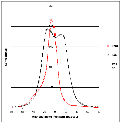 Зависимость контрастности (отношения яркости белого поля к яркости черного) в центре экрана от отклонения оси датчика (отрицательные значения — влево или вниз, положительные значения — вправо или вверх) от нормали к экрану в вертикальной и горизонтальной плоскостях. Зеленая линия — отношение 10:1, голубая — 5:1