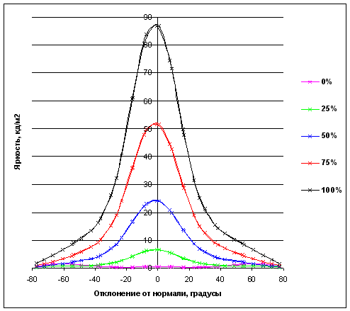 Зависимость яркости полутонов (0% — черный, 100% — белый) в центре экрана от отклонения оси датчика (отрицательные значения — вниз, положительные значения — вверх) от нормали к экрану в вертикальной плоскости