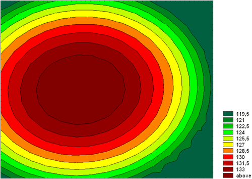 Поверхность, построенная по значениям яркости белого поля. Изолинии через 1,5 кд/м2