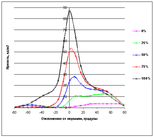 Зависимость яркости полутонов (0% — черный, 100% — белый) в центре экрана от отклонения оси датчика (отрицательные значения — влево, положительные значения — вправо) от нормали к экрану в горизонтальной плоскости