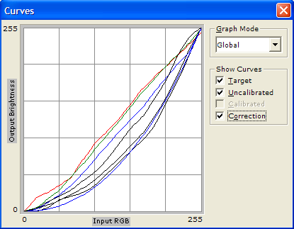 Приведены также графики гамма-кривых, где можно увидеть, насколько гамма-кривые индивидуальных цветов (черные линии) отклоняются от целевой гамма-кривой (синяя линия) и какая требуется коррекция для каждого цвета (соответственно красная, синяя и зеленая линии).