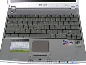 При открытой крышке ноутбук также достаточно узнаваем (если можно говорить об «узнаваемости», протестировав две модели). Характерная решетка, скрывающая динамики, в нижней части «рабочей поверхности» становится отличительной чертой ноутбуков от Samsung. Правда, расстояние между самими источниками звука у Q20 настолько мало, что наличие двух динамиков все равно не позволяет говорить о стереозвучании. Клавиатура ноутбука отличается от «усредненной полноразмерной» ноутбучной клавиатуры в основном отсутствием правого ряда кнопок. В связи с этим изменен блок клавиш управления курсором. Клавиши Home и End расположены над стрелками «вправо» и «влево» (обычно у полноразмерных ноутбуков эти места пустуют), поэтому с непривычки возможно их случайное нажатие. PgUp и PgDn совмещены со стрелками «вверх» и «вниз» и работают при нажатой клавише Fn. Если привыкнуть, такое расположение клавиш позволяет весьма комфортно работать с текстами. К сожалению, клавиши Ins и Del расположены далековато в верхнем правом углу, но это характерно для большинства ноутбуков, так же, как и клавиша Fn в левом нижнем углу на месте Ctrl у «десктопных» клавиатур. Еще одна интересная особенность клавиатуры клавиша NumLock не обременена дополнительными функциями, a в BIOS предусмотрена возможность включения цифровой клавиатуры «как у больших» просто нажатием NumLock (без Fn). Практическая ценность этой возможности сомнительна, но она есть.