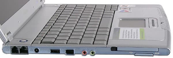 Здесь применен «десктопный» вариант разъема IEEE 1394, включающий контакты питания. Такое решение позволяет использовать внешнее устройство работы с оптическими дисками (или внешний жесткий диск) без дополнительного адаптера, что, согласитесь, немаловажно, учитывая габариты ноутбука.