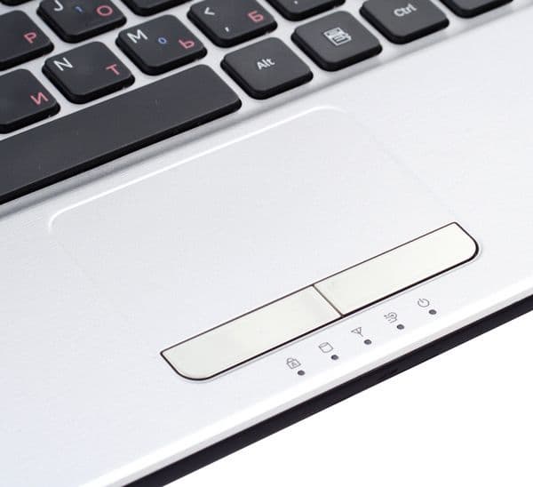 У тачпада две кнопки, нажимаются они с четким щелчком и жестко. Пользоваться ими не очень приятно. К тому же, они плохо смотрятся на корпусе: зеркально-серебристые на матовом. Кроме того, у них неровная поверхность, на которой очень хорошо видны любые загрязнения, а загрязняются кнопки тачпада быстро.