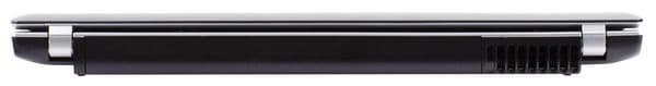 Сзади также нет разъемов. Здесь находится батарея, занимающая почти всю заднюю поверхность ноутбука (впрочем, если и делать более мощную, назад ее не выдвинешь, сюда откидывается крышка, разве что размещать дополнительный ряд элементов внизу), и решетка вентиляции.