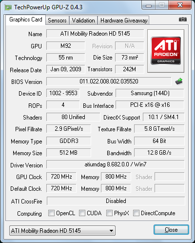В качестве видеокарты, судя по спецификации, может устанавливаться как Radeon HD5470 из нового семейства с поддержкой DirectX 11, так и HD5145. Это дискретная видеокарта, несмотря на пятерку в модельном номере, имеющая поддержку лишь DirectX 10.1 и отличающаяся от HD4570 лишь более высокими частотами. Нам достался экземпляр именно с такой картой, тем не менее, по меркам своего класса ноутбук должен показать неплохие результаты в играх.