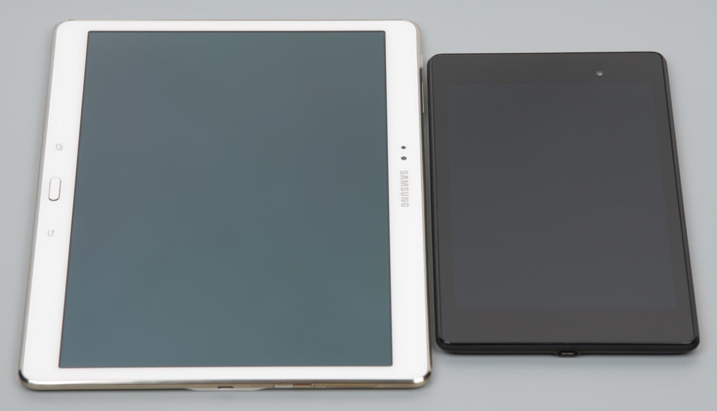 Лицевая поверхность экрана выполнена в виде стеклянной пластины с зеркально-гладкой поверхностью, устойчивой к появлению царапин. Судя по отражению объектов, антибликовые свойства экрана несколько хуже, чем у экрана Google Nexus 7 (2013) (далее просто Nexus 7). Для наглядности приведем фотографию, на которой в выключенных экранах отражается белая поверхность (справа — Nexus 7, слева — Samsung Galaxy Tab S 10.5, далее их можно различать по размеру):