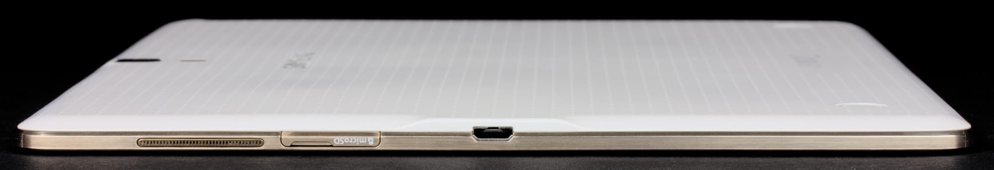 Грани выполнены из золотистого пластика (и в светлой, и в темной версиях планшета). Помимо динамиков на боковых гранях планшета мы видим слот для карты памяти microSD, разъем Micro-USB (поддерживает подключение внешних накопителей по интерфейсу OTG) и гнездо 3,5 мм для подключения гарнитуры.