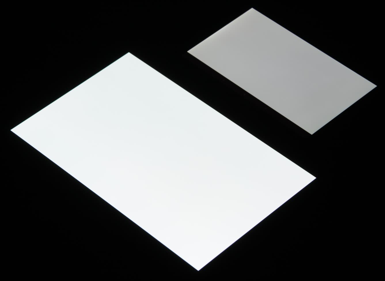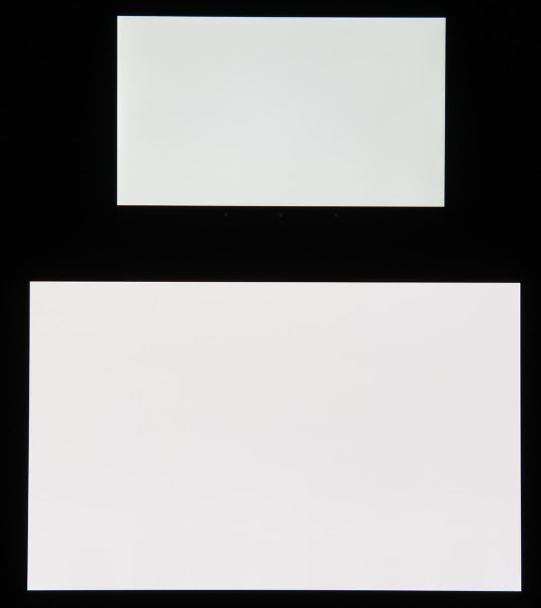 Экран характеризуется великолепными углами обзора, правда белый цвет при отклонении на большие углы приобретает легкий сине-зеленый оттенок, но черный цвет — просто черный под любыми углами. Настолько черный, что параметр контрастности в данном случае просто неприменим. При перпендикулярном взгляде равномерность белого поля отличная. Для сравнения приведем фотографии, на которых на экраны Galaxy Tab S 10.5 и второго участника сравнения выведены одинаковые изображения, при этом яркость экранов изначально установлена примерно на 200 кд/м², а цветовой баланс на фотоаппарате принудительно переключен на 6500 К.