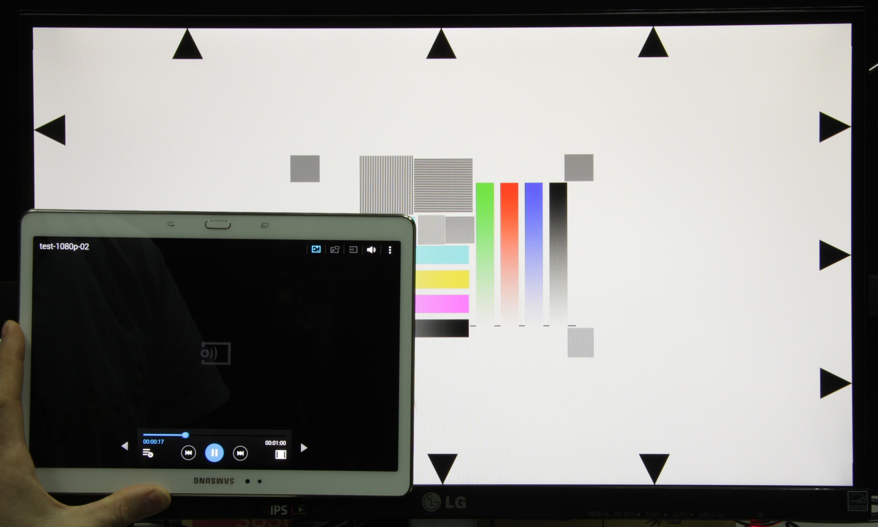 Особого описания заслуживает вывод видео. Для начала с помощью набора тестовых файлов с перемещающимися на одно деление за кадр стрелкой и прямоугольником (см. «Методика тестирования устройств воспроизведения и отображения видеосигнала. Версия 1 (для мобильных устройств)») мы проверили, как видео выводится на экран самого планшета Samsung Galaxy Tab S 10.5. Снимки экрана с выдержкой в 1 с помогли определить характер вывода кадров видеофайлов с различными параметрами: варьировались разрешение 1280 на 720 (720p) и 1920 на 1080 (1080p) пикселей и частота кадров 24, 25, 30, 50 и 60 кадр/с. В этом тесте мы использовали видеоплеер MX Player в режиме «Аппаратный+». Результаты этого (блок, озаглавленный как «Экран планшета Samsung Galaxy Tab S 10.5») и следующего теста сведены в таблицу: